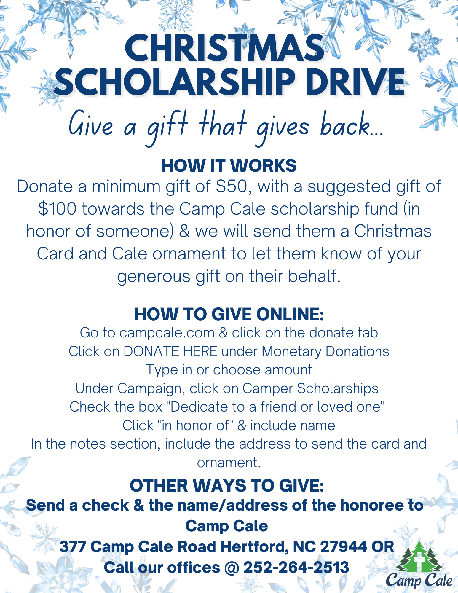 Donate a minimum gift of $50, with a suggested gift of $100 towards the Camp Cale scholarship fund (in honor of someone) & we will send them a Christmas Card and Cale ornament to let them know of your generous gift on their behalf. See the instructions below!