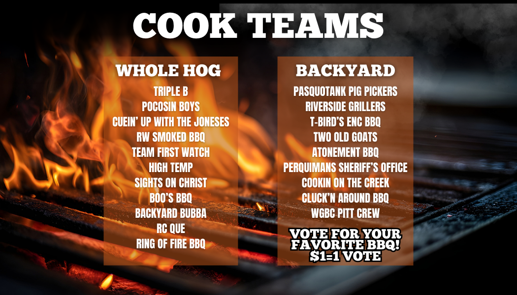 What’s the difference between Whole Hog BBQ Teams and Backyard BBQ Teams? Our Whole Hog BBQ teams are competing in a sanctioned event, the Whole Hog Barbecue Series by the NC Pork Council. Winners may be eligible to compete in the Whole Hog Barbecue Championship Cook-off. Backyard BBQ Teams compete for the People’s Choice Award, where the public votes on their BBQ. Backyard BBQ Teams will also be judged (separate from the Whole Hog Competition) for the Best BBQ. Backyard BBQ teams will also each have their own sauce/preparation method and the Sanctioned Whole Hog teams will have their BBQ sent to the kitchen to all be prepared with the same sauce.
